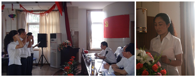 黨委委員陳濤同志宣讀了公司黨委《關(guān)于接收預(yù)備黨員和預(yù)備黨員轉(zhuǎn)正的審批意見》,預(yù)備黨員們?cè)邗r紅的黨旗下莊嚴(yán)宣誓,業(yè)務(wù)管理部黨支部王育紅同志代表預(yù)備黨員做了發(fā)言。