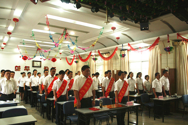 領(lǐng)導(dǎo)班子起立奏《國(guó)際歌》 黨委委員陳濤宣讀審批意見