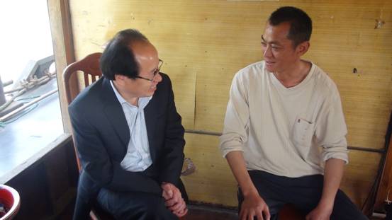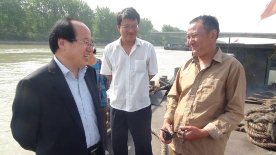 經(jīng)過一夜航行,15日上午,船隊(duì)已行至高郵附近,雖然在震耳欲聾的機(jī)器轟鳴聲中大家都沒休息好,但船隊(duì)仍以每小時(shí)4、5公里的速度不知疲倦地前行。在12號隊(duì)隊(duì)長劉永玉的陪同下,董事長余龍懷帶著同行的公司副經(jīng)理助理、航運(yùn)部部長田學(xué)銀,副經(jīng)理助理、黨群工作部(人力資源部)部長梁斌來到駁船上,與每條駁船上的船員進(jìn)行談心。
