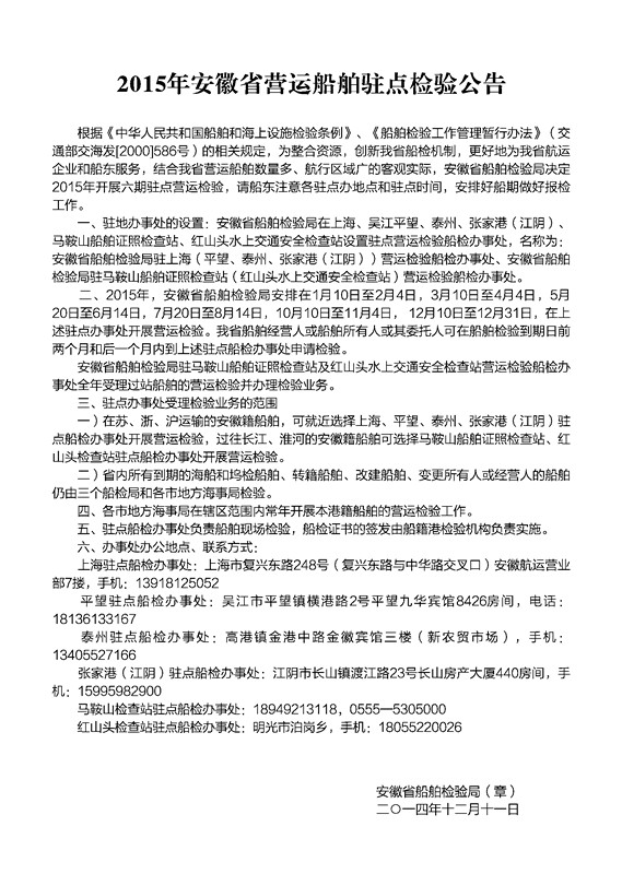 1. 2015年安徽省營(yíng)運(yùn)船舶駐點(diǎn)檢驗(yàn)公告