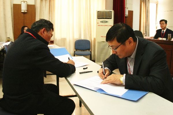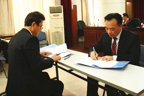 黨委書記、董事長劉曹應(yīng)與職工代表、工會主席梁斌簽訂《舜龍公司集體合同》、《舜龍公司工資集體合同書》