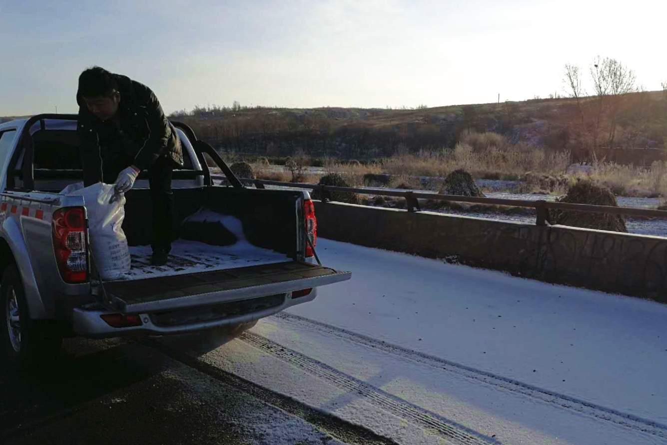 好在這場冬雪持續(xù)的時間并不算長,十四日夜間就已基本停止降雪,這對我們來說是件很開心的事情。同時根據(jù)冬季極端條件下發(fā)運預案,公司準備了工業(yè)鹽,準備在積雪路段撒鹽融冰,爭取盡早恢復安全路況,來保證發(fā)運計劃能夠順利完成。