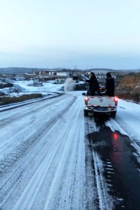 唐家會礦雪下得稍晚一些,6日下午,唐家會礦下起中雪,直接導(dǎo)致當(dāng)天發(fā)運(yùn)不到19時就早早結(jié)束。7日一早,唐家會礦物流分公司會同自有車隊人員全面組織開展融雪除冰工作,從分公司經(jīng)理到業(yè)務(wù)員全部出動,冒著寒風(fēng)對唐家會到托電40多公里的路段進(jìn)行撒鹽,一直到晚上近22時才全部結(jié)束,共撒鹽4噸多。大家整整一天的撒鹽又冷又累,但換來的成效非常明顯:8日一早,車輛陸續(xù)恢復(fù)發(fā)運(yùn),全天共發(fā)運(yùn)152車5569噸。