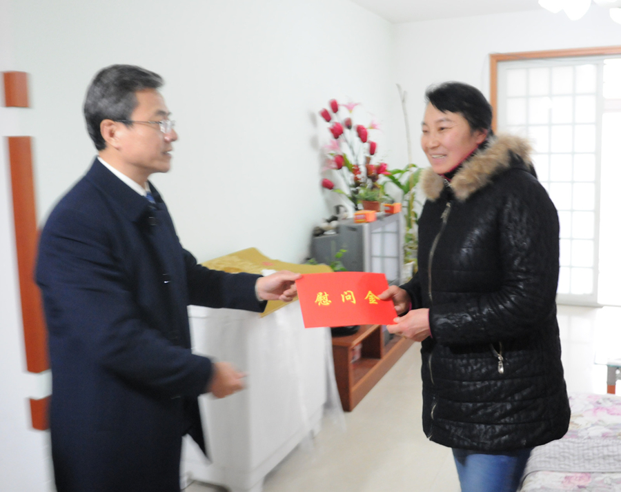 公司黨委副書記、紀委書記、工會主席梁斌為困難職工家庭送上慰問金